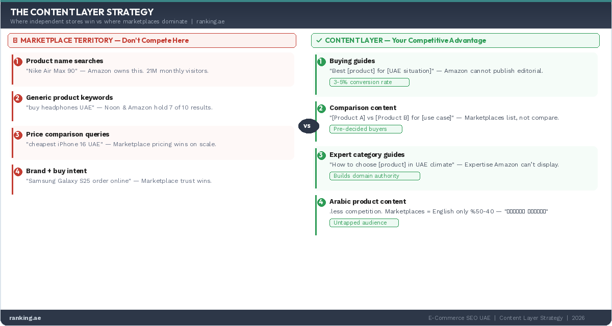 We call this the Content Layer. It's the search territory that marketplaces cannot occupy because their architecture doesn't support it. Amazon.ae is built to display product listings. It cannot publish "The 10 Best Running Shoes for Training Outdoors in Dubai Summer: A Runner's Guide for 40-Degree Heat." Noon cannot produce "Organic vs Non-Organic Baby Food in the UAE: What the Labels Actually Mean Under Emirates Authority for Standardization Rules." Their site structure, their content management systems, their entire business model is optimized for transactions, not editorial guidance.