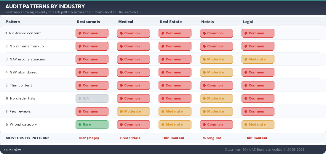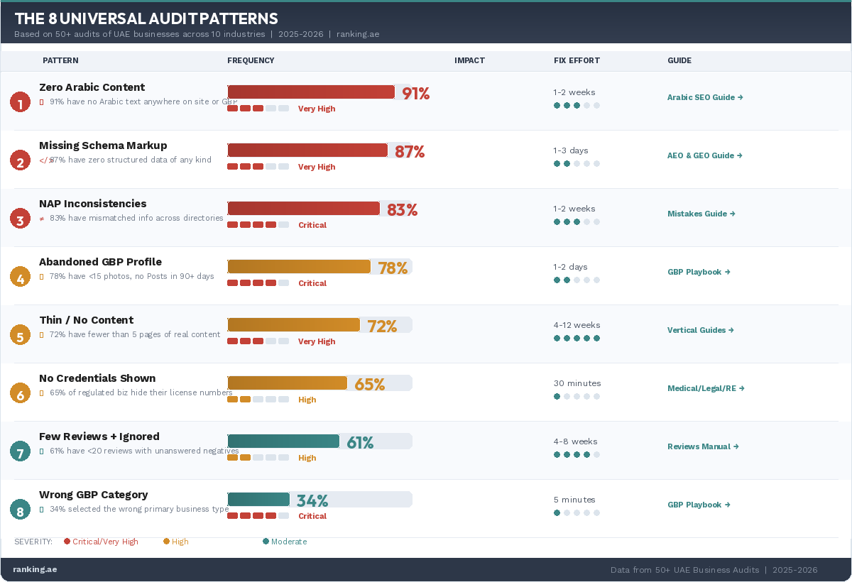 Some are universal. Abandoned GBPs, thin content, NAP inconsistencies, and review problems show up everywhere in the world. But two patterns are distinctly UAE-specific: the Arabic content gap (Pattern 1) and the regulatory credential gap (Pattern 6 covering DHA, RERA, DTCM, DIFC, and other UAE licensing authorities). These two patterns create outsized opportunity specifically because global SEO advice ignores them entirely. Businesses following international playbooks miss the two patterns that matter most in this market.