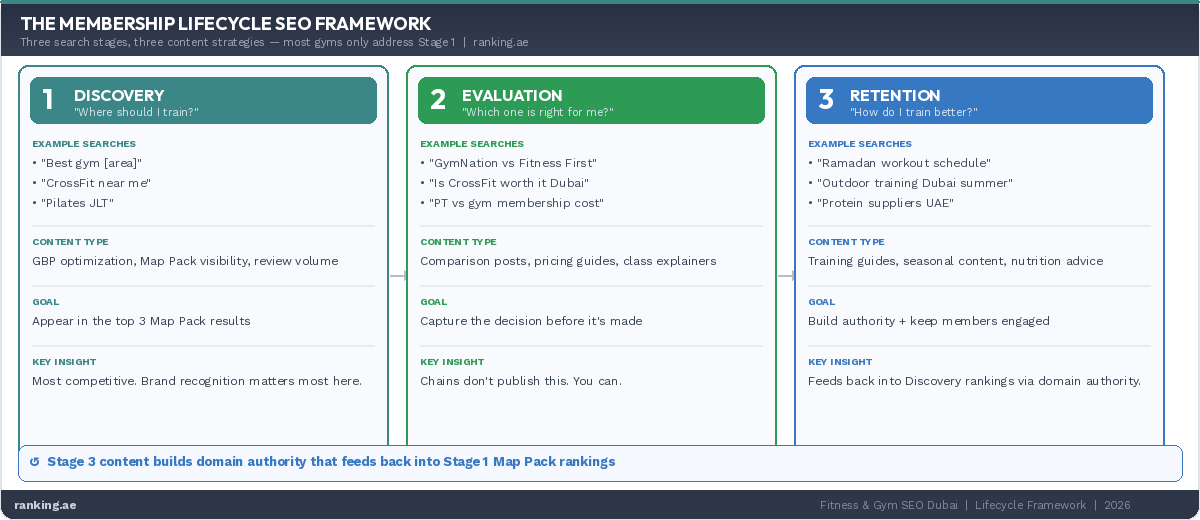 The gyms that rank in 2026 don't just capture Discovery. They own all three stages. Each piece of Retention-Adjacent content reinforces Discovery visibility because Google sees a fitness domain that publishes regularly, earns traffic, and demonstrates genuine expertise across the subject.
