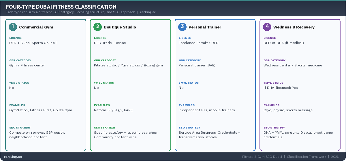This is where most fitness marketing advice falls apart. It treats "gym SEO" as one thing. It isn't. Dubai has four distinct types of fitness business, each with a different licensing structure, a different GBP category requirement, and a different content strategy.