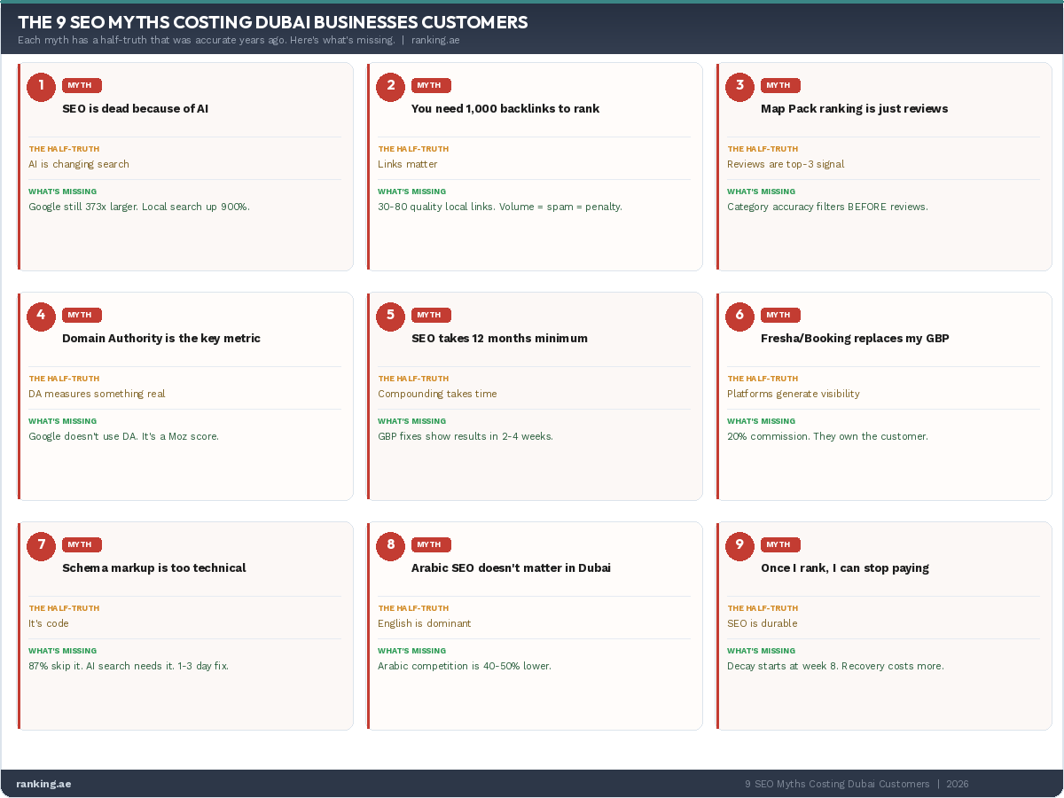 Most apply globally, but some have specific local consequences. Myth 8 (Arabic does not matter) is uniquely costly in the UAE because of the bilingual market. Myth 6 (booking platforms replace GBP) hits harder in Dubai because Fresha, Talabat, Booking.com, and Bayut have unusually high market penetration here. The other myths show up in every market we have worked in.