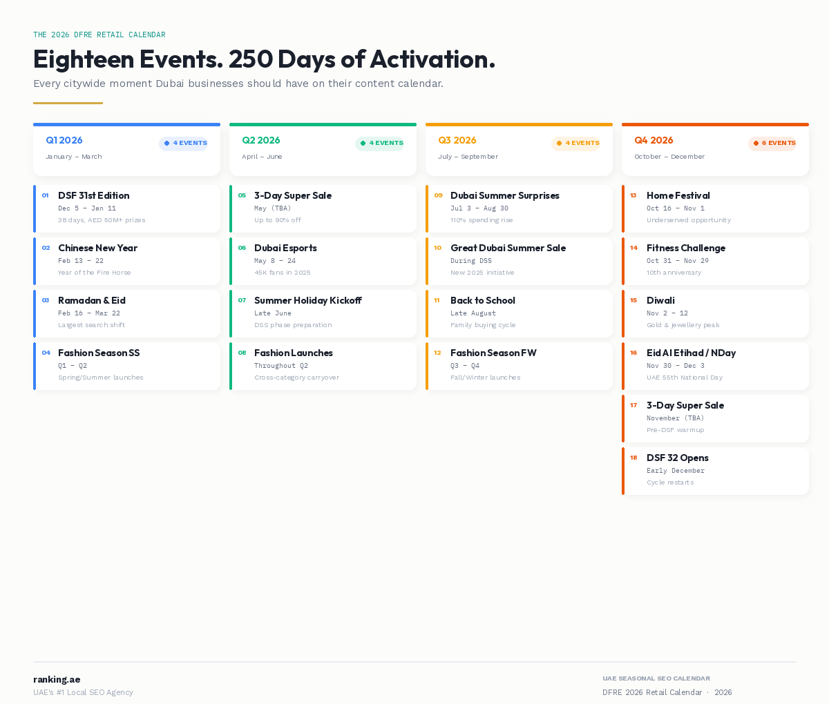 The Dubai Festivals and Retail Establishment operates under the Dubai Department of Economy and Tourism and runs what is now the 10th anniversary edition of the official Retail Calendar. The 2026 calendar contains 18 citywide events spanning 250 days of the year. Many of them run sequentially. Several overlap. All of them produce measurable search behavior in the weeks before, during, and immediately after they occur. Here is the full list, organized chronologically with confirmed dates from the official DFRE announcement and subsequent coverage in Arabian Business and Time Out Dubai.