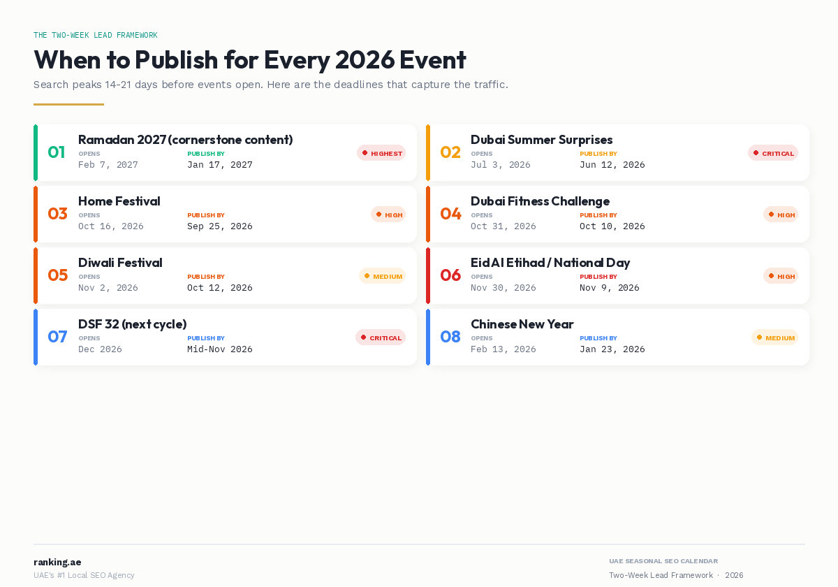 The highest-competition events on the DFRE calendar are Ramadan, DSF, and DSS. Every Dubai agency publishes something about these. Competition for ranking is fierce. The events that most businesses ignore are the ones where the opportunity is largest because the SERP is less saturated.